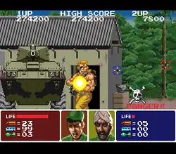 In stages 4 and 6, killing one of the hostages will decrease the player's life. At least one hostage must be rescued in those stages, or the game is over. In Stage 8, the players must engage with the lead hijacker holding the pilot hostage. Continues are not permitted. If the pilot gets killed, a bad ending will be shown "The pilot is dead; escape is impossible". If the hijacker is killed, the good ending will be shown where the player and hostages flee the hostile nation, with the plane's takeoff.
