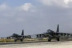 In September 2015, the U.S. Department of Defense released satellite photos of an airfield in Latakia, a Syrian government-controlled city, showing twelve Su-25 planes on the tarmac.[57] Airstrikes by Russian forces in support of the Assad government began later that same month. The aircraft have been used predominantly to strike opposition vehicles, fighting positions, artillery pieces, and other non-strategic targets in the country.[58]