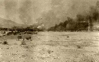 ![]() A Mahsud village burning during the 1917 operations.[2] From 15–19 June, British forces burnt and looted several abandoned Mahsud villages in their vicinity without opposition.[3] | |||||||
