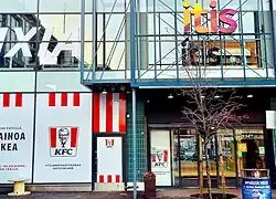 On 11 November 2021, Finland's first KFC restaurant was finally opened at the Itis shopping center in Itäkeskus, Helsinki.[123] A few days before the opening day, a tent had appeared in front of the restaurant, where a man who had kept his identity secret for a few days had stayed,[124] and who on the opening day revealed himself to the public as a vegan activist defending animal rights.[123][125][126] After trying to give his speech to those present, the security company carried him away.[123] In an interview before the opening and the revelation of the animal rights campaign, the man gave a statement "Kanoista tykkään. Kuka muu olisi niin hullu, että olisi täällä näin pitkään?" ("I like chickens. Who else would be crazy enough to be here for so long?").[124] On November 18, it was reported that there would be about two hour-long queues at Itis' KFC restaurant even a week after the opening, which would extend as far as the entrance to the mall.[126]