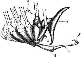 The chelicerae consist of three segments, with the distal two forming a pincer[3] equipped with a row of teeth. Based on developmental gene expression data, the proximal segment is thought to be homologous to the femur and patella of the legs, the middle segment to the tibia through the tarsus of the legs, and the distal segment to the apotele (the claw with its modifications).[1][4] Functional genetic data have shown that knockdown of the transcription factor dachshund transforms the three-segmented chelicera into the two-segmented variant found in groups like pseudoscorpions and solifuges.[5]