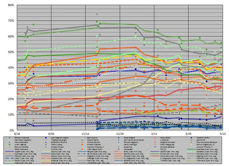 | 15 | Poe (Ind.), 23% | R. Magsaysay (LP), 28.8% | R. Magsaysay (LP), 29% | Aquino (LP), 34% | Gordon (UNA), 30.0% | ||