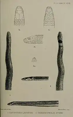 - Stejneger L (1926). "Chinese Amphibians and Reptiles in the United States National Museum". Proceedings of the United States National Museum 66 (2562): 1–115. (Tapinophis latouchii, p. 77).