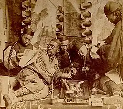 Before the 1840s, no exact record of opium farms was found. In 1845 to 1860, there were records of opium farms under Tay Eng Long, Lao Joon Teck, and Cheang Sam Teo. Between 1847 and 1853, the Temenggong was receiving $350 per month as rental fees for his opium and spirit farms. However, seeing the growth in population in Singapore and the demand for opium, they raised the rental fees for every new contract negotiation. In 1860, the rental fees increased to $8,000 per month.[8] From 1860s onwards, there was increasing competition for opium farms; forces of Johor farmers and Singapore farmers were openly fighting each other.[9] Opium dens controlled by the farmers spurred up rapidly with the secret societies.[10]