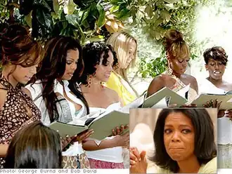 During the luncheon, Oprah called-forward poet and author Pearl Cleage, whom had written a special poem in the legends' honor titled "We Speak Your Names".[3] The poem featured passages mentioning the names of the legends, followed by the repeated phrase "we speak your names".[3] The words paid tribute to the legends' many accomplishments, not only in entertainment but in American society and the fight for justice and civil rights. One-by-one, many of the "young'uns"—including Alfre Woodard, Angela Bassett, Ashanti, Halle Berry, Mariah Carey, Mary J. Blige and Missy Elliott—were also called to the front of the outdoor room to recite verses from the emotional and retrospective poem (which each guest received published copy of). At the end of the luncheon, Oprah surprised her guests with a parting gift: the "legends" received black diamond drop-earrings while the "young'uns" received diamond hoop-earrings.[3]