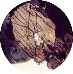 Pleochroism is often especially intense in small spots which surround minute enclosures of other minerals, such as zircon and epidote. These are known as "pleochroic halos".[4]