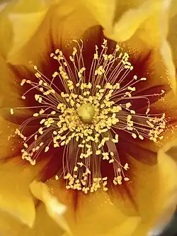 The plant flowers from March to May, with bright yellow flowers bearing red centres which produce red/purple fruits.[1] Opuntia azurea forms sprawling clusters, two to three feet high.[2]