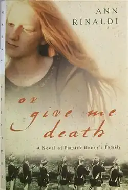 Or Give Me Death (ISBN 0-15-216687-4) is a 2003 work of historical fiction by Ann Rinaldi based on the possibility that the famous words of Patrick Henry's "Give me Liberty or Give me Death!" speech may have been first spoken by his dying, mentally ill wife, Sarah, whom he kept locked up in a cellar to prevent her from hurting anyone. The story is told through the eyes of his daughter, Patsy Henry. It is also told by his younger daughter, Anne Henry. Patrick Henry travels throughout the Thirteen Colonies, advocating independence from Britain.