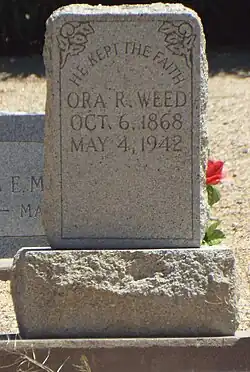 Ora Rush Weed was born in Hardin, Ray County in Missouri. He was married to Phoebe Pomeroy Weed with whom he had 7 children. Weed became an ordinated Methodist minister. Soon, he moved with his family moved to Anderson County, Kansas. He was stern as a minister and believed that Methodism was too soft in the teachings of Christianity. Therefore, he moved to Gridley, Coffery, Kansas and finally to the Territory of Arizona in 1911.[1][2]