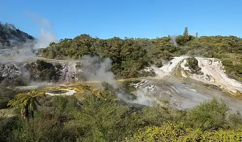 Orakei Korako is a highly active geothermal area most notable for its series of fault-stepped sinter terraces, located in a valley north of Taupō on the banks of the Waikato River in the Taupō Volcanic Zone, New Zealand. It is also known as "The Hidden Valley".[1]