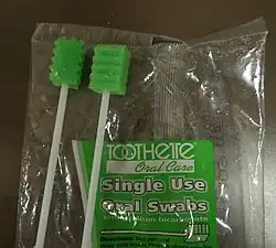 Oral care swabs are disposable, single-use oral care sponges attached to a stick. They are used for oral care in the hospital and long-term care setting.[1] Disposable oral care swabs may also be known by other various names, such as sponge swab,[2] swabs for oral care,[2] foam swab,[3] mouth swab,[4] oral swabstick, and the trademark name Toothette.
