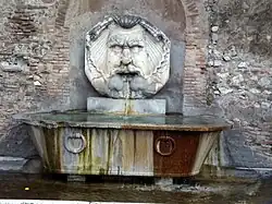The fountain at the entrance in Piazza Pietro D'Illiria is made up of two separate pieces: a Roman thermal bath, and a monumental marble mask originally carved to adorn a fountain built in 1593 by Giacomo della Porta for a cattle market (Campo Vaccino) in the centre of Rome. The mask has a long history. After the dismantling in 1816 of the Campo Vaccino fountain, it was recovered and from 1827 used to decorate a fountain erected on the right bank of the Tiber. This fountain was demolished in 1890 and the sculpture was kept in municipal warehouses until being moved to its present location.