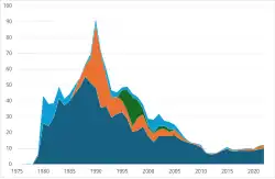 Orange roughy fisheries exist primarily in New Zealand, Australia and Namibia.[5] Annual global catches began in 1979 and increased significantly to a high of over 90,000 tonnes in 1990. These high catch levels quickly decreased as stocks were fished down. For many stocks, the lack of understanding of the biological characteristics meant that they were overfished. By the end of the 1990s, three of the eight New Zealand orange roughy fisheries had collapsed and were closed.[2] Because of its longevity, late maturation and relatively low fecundity, orange roughy stocks tend to recover more slowly than most other species.[5][24]