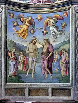 The oratory is located near the 18th-century Chiesa del Suffragio and is named after the Virgin of the Annunciation, considered in those days to be the patron saint of the city. It was restored in the 19th century. Among the decorations is the prominent fresco of the Baptism of Jesus painted between 1497 and 1507 by Pietro Perugino.