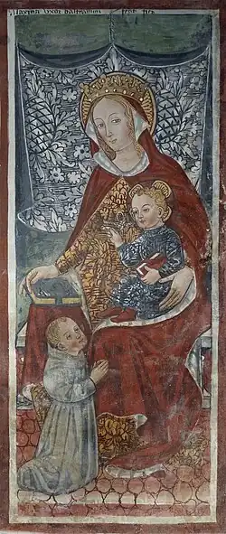 Madonna enthroned with Child and a little friar | Massara attributed the work to Tommaso Cagnola, estimating its creation in the same years as the Madonna with patron and Saint Francis, around 1481. In it Massara observed characteristics common to two other works on the same wall: the Madonna enthroned with Child (of the shoe) and the Madonna enthroned with naked Child.[25]