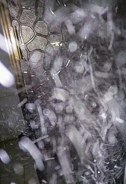 Some ghost hunters have claimed that orb shaped visual artifacts appearing in photographs are spirits of the dead.[8][9] Such perceptions have been interpreted by Michael Shermer as examples of agenticity.[10] Prominent paranormal investigators such as Joe Nickell have agreed with skeptic-debunkers' assessments that orbs result from natural phenomena like insects, dust, pollen, or water droplets.[11][12]