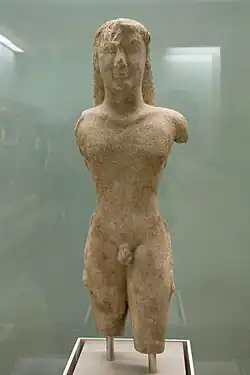 Orchomenos gives its name to a period of sculpture of archaic Kouroi, the Orchomenos-Thera group of 590–570 BC. This period witnessed a lull in Attica, but activity was more vigorous in Boeotia, especially from the Ptoon sanctuary and Orchomenos (NAMA 9).