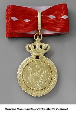 The Order of Cultural Merit (French: Ordre du Mérite culturel; Monégasque: U̍rdine d’u Me̍ritu Cürtürale) is the fourth highest Order of the Principality of Monaco.[1] The order was established by Rainier III, Prince of Monaco on 31 December 1952 by Sovereign Order 689.[2] It is awarded to recognize those who have made a distinctive contribution to the arts, letters or science through their work or teaching in Monaco. It may also be awarded to recognize individuals in those areas who have extended the intellectual influence of the Principality, even from outside Monaco.[1]