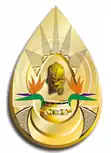 The egg-shaped badge depicts a rising sun, a "Lydenburg head", two strelitzia flowers, a drum, three circles, and two roadways. The head represents the arts, the sun represents glory, the circles symbolise sport, and the roads represent the long road to excellence.[2] The South African coat of arms is displayed on the reverse.