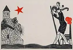 Recipients were also given a monetary prize and an Eric Gill designed certificate, depicting Saint Christopher, in front of a smoking chimney, carrying the Christ Child across water, towards a walled garden ("A Rose Plant in Jericho"[5]) with a red star overhead,[6][7][8] Certificates for individual men were inscribed:[9]