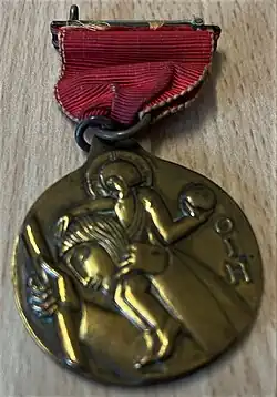 The medal of the Order was designed by sculptor Eric Gill and issued in bronze with a burgundy ribbon. The medal bears the image of Saint Christopher bearing the Christ Child.