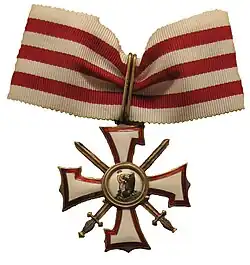 The Order of Lāčplēsis (also Lāčplēsis Military Order, Latvian: Lāčplēša Kara ordenis), the first and the highest Latvian military award, was established in 1919 on the initiative of Jānis Balodis, the Commander of the Latvian Army during the Latvian War of Independence. The Lāčplēsis Order is awarded in the first, second and third class. Initially, a holder of the order had to be a recipient of the third class before being promoted to a higher class. It was named after the Latvian epic hero, Lāčplēsis. As a young man, Lāčplēsis kills a bear with his bare hands and thus the order is also known as the Order of the Bearslayer.
