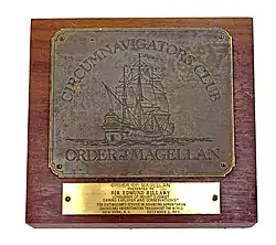 The Order of Magellan is an honor bestowed on distinguished individuals who have circumnavigated the Earth and who, to the course of their career, have contributed to the world of science or the environment or future progress through peace and understanding. Among the pantheon of winners of this award are Douglas MacArthur, philanthropist and mountaineer Sir Edmund Hillary, ethnographer and adventurer Thor Heyerdahl, Dr. William Walsh, who started Project Hope, oceanographer and underwater archaeologist Dr. Robert Ballard, oceanographer Jacques-Yves Cousteau, and astronaut and United States Senator John Glenn. The Magellan Award is the highest award bestowed by the Circumnavigators Club,[1] founded in 1902. The honor is named after the Portuguese born explorer, Ferdinand Magellan, who is widely known as the first captain to sail around the world—though he didn't complete the circumnavigation as he died during the voyage in the Philippines, that being the Spanish navigator Juan Sebastián Elcano, who took over command of the expedition after Magellan's death, and completed the trip.