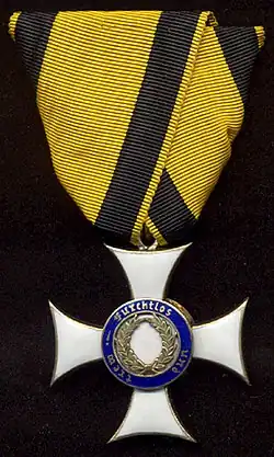 The ribbon of the order was, until 1818 and after 1914, yellow with broad black stripes near each edge. After November 1917, when the ribbon was worn without the medal, the ribbon bore a green-enameled wreath to distinguish it from other Württemberg decorations on the same ribbon. The ribbon from 1818 to 1914 was blue.[3]