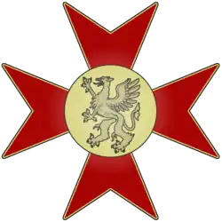 The badge of the order was a red enameled maltese cross, outlined in gold. On the centre of the cross is a disc with a golden griffon surrounded by a gold ring. The Grand Cross badge was worn at the left hip, hanging from a 4 in wide sash that goes over the right shoulder. The Grand Commander's and Commander's Cross badges were worn suspended from the neck on a narrower ribbon. These badges were slightly smaller than the Grand Cross badge, but otherwise identical in appearance. The Honour Cross was smaller still and did not have the gold ring surrounding the griffon in the centre. Finally, the two Knight's Crosses were slightly smaller than the Commander's Cross and worn suspended from a ribbon worn on the left chest.[1]