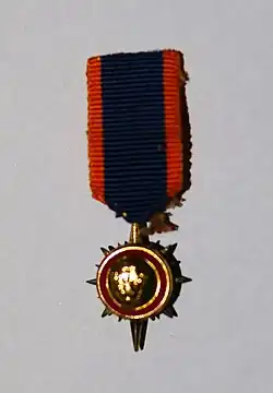 The Miniature Badge of the Order is a miniature of the Badge measuring 20mm in diameter and is worn as a miniature medal pendant from a miniature of the riband measuring 15mm wide.