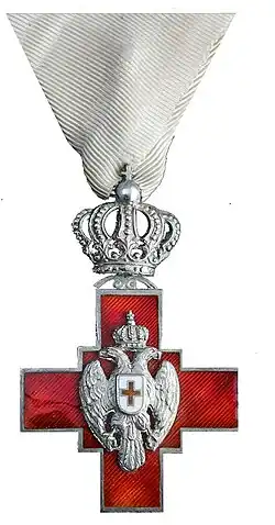 The Order of the Red Cross (Serbian: Орден Црвеног крста) was a military decoration of the Kingdom of Serbia, Kingdom of Serbs, Croats and Slovenes and Kingdom of Yugoslavia. Established in 1876 and first awarded in 1877 by the Serbian Red Cross Society, it was awarded for exceptional care of the wounded and sick during war time.[1] Decorations of the Serbian Red Cross Society had the rank of state decorations.[2]