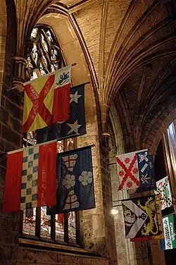Each member of the order, including the sovereign, is allotted a stall in the chapel, above which his or her heraldic devices are displayed. Perched on the pinnacle of a knight's stall is his helm, decorated with mantling and topped by his crest. If he is a peer, the coronet appropriate to his rank is placed beneath the helm.[56] Under the laws of heraldry, women, other than monarchs, do not normally bear helms or crests;[57] instead, the coronet alone is used (if she is a peeress or princess).[58] Lady Marion Fraser had a helm and crest included when she was granted arms; these were displayed above her stall in the same manner as for knights.[59] Unlike other British orders, the armorial banners of Knights and Ladies of the Thistle are not hung in the chapel, but instead in an adjacent part of St Giles High Kirk.[60] The Thistle Chapel does, however, bear the arms of members living and deceased on stall plates. These enamelled plates are affixed to the back of the stall and display its occupant's name, arms, and date of admission into the order.[61]