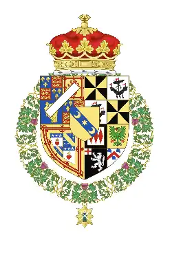 Some Scottish order of chivalry may have existed during the sixteenth century, possibly founded by James V and called the Order of St. Andrew, but lapsed by the end of that century, although the evidence is unclear.[10][11] A royal thistle collar is depicted in a book of hours, prepared for James IV in about 1503, where he is shown kneeling at an altar bearing the royal arms encircled by a collar of thistles and a badge depicting St Andrew.[12] In a painting of 1538, James V is shown wearing a gold collar of linked thistles with a St Andrew badge, although the King's wardrobe inventories of the period make no mention of a thistle collar.[13]