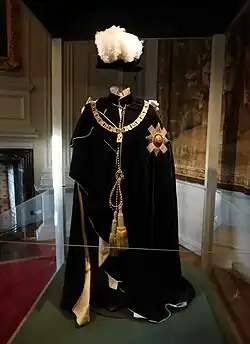 The order has five officers: the Chancellor, the Secretary, the Dean, Lord Lyon King of Arms, and the Gentleman Usher of the Green Rod. The Dean is normally a cleric of the Church of Scotland. This office was not part of the original establishment, but was created in 1763 and joined to the office of Dean of the Chapel Royal.[37] The two offices were separated in 1969.[38] The office of Chancellor is mentioned and given custody of the seal of the order in the 1687 statutes, but no-one was appointed to the position until 1913.[39] The office has subsequently been held by one of the knights, though not necessarily the most senior. The Usher of the Order is the Gentleman Usher of the Green Rod (unlike his Garter equivalent, the Gentleman Usher of the Black Rod, he does not have another function assisting the House of Lords).[40] The Lord Lyon King of Arms, head of the Scottish heraldic establishment, whose office predates his association with the order, serves as King of Arms of the Order.[41]