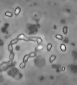 In comparison to the merozoites, the sporonts have a less dense cytoplasm.[1] Electron-dense secretions create a thick layer on the surface and tubular material (63-65 nm in diameter) is produced. The earliest sporonts are elongated oval cells with two nuclei and these sporogonial stages occur often pairwise. This pairwise structure leads to the interpretation of two sporoblast mother cells, which have failed to separate during the first division of the sporont. After another nuclear division, each sporoblast mother cell turns into a chain of four sporoblasts. Since the separation of the initial division has failed to complete, the two chains are still connected, leading to chains of eight mature spores. These eight spores are not only externally linked but also via cytoplasmic bridges.[1]