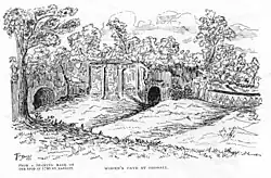 Before the River Irwell was deepened to make it navigable there was an ancient, paved ford at Ordsall known as Woden's Ford and nearby, in a lane leading to Ordsall Hall, was a cave known as Woden's Den. The cave was of great interest to 19th-century antiquarians, but their constant trespassing to view the site prompted the landowner to completely destroy it early in the century, and no trace of the feature remains. However, the cave was described and sketched by Thomas Barret in about 1780.[note 1][4] He postulated that, as this part of the Irwell was subject to regular flooding, travellers would have made offerings to Odin, the protector of travellers, before attempting the crossing.[3] He also said that there were strong grounds to suppose that Cluniac monks of Lenton Priory, who had a cell called "St Leonards" at nearby Kersal, converted the cave into a Christian hermitage and served as guides to the crossing at Woden's Ford and the surrounding marshes in order to supplant the earlier pagan practices.[3][5]