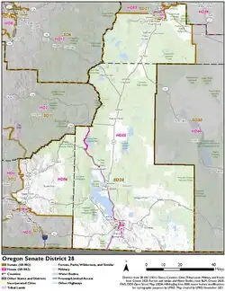 District 28 of the Oregon State Senate comprises all of Klamath County as well as parts of Deschutes and Jackson counties. The district is composed of Oregon House districts 55 and 56. It is currently represented by Republican Diane Linthicum of Beatty.