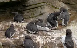 The aviary at Oregon Coast Aquarium exhibits sea and shore birds. Those on display include the seabirds tufted puffin, common murre, rhinoceros auklet, pigeon guillemot, and the shore bird black oystercatcher. The seabird aviary includes two large pools and rocky cliffs.