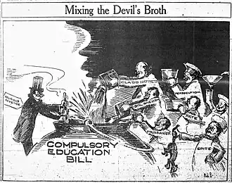 In 1922, the Masonic Grand Lodge of Oregon sponsored an initiative to require all school-age children to attend public schools, officially called the Compulsory Education Act and unofficially known as the Oregon School Law.[3] With support including the state Ku Klux Klan and 1922 Democratic gubernatorial candidate Walter M. Pierce, the law was passed by a referendum vote of 115,506 to 103,685.[4] It aimed mainly to shut down Catholic schools in Oregon, but also affected other private and military schools.