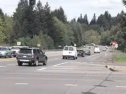 Oregon Route 22 begins at Interstate 5 and travels up Market Street, Lancaster Drive and Silverton Road in Salem. It continues northeast on Silverton Road and intersects Oregon Route 214 in the town of Silverton. It travels north out of the town and proceeds that direction for twelve miles until it reaches Molalla. North of Molalla it comes to the communities of Liberal, Mulino and Carus where it continues northward as a two-lane, undivided route. In the vicinity of Clackamas Community College it intersects with Molalla Avenue. This part of the road is known alternatively as 82nd Drive, the Oregon City Bypass or the Trails End Highway. It heads north on a four-lane expressway through a scenic canyon on Oregon City's eastern edge for about three miles before running parallel with Interstate 205, mainly serving local traffic and local businesses. Here, as it heads north, it becomes Northeast and Southeast 82nd Avenue, a major five-lane traffic artery through east Portland to terminate on the grounds of Portland International Airport at an intersection with Airport way halfway between Interstate 205 and the airport terminal.[1]