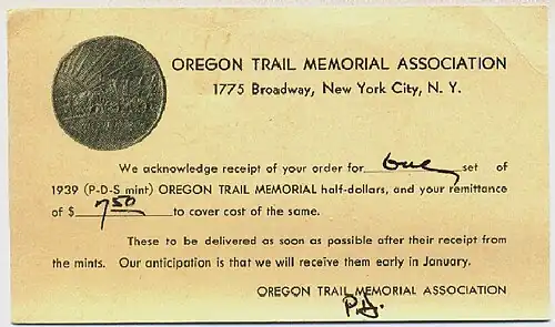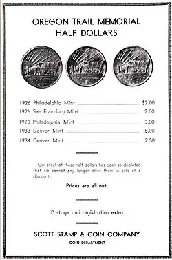 27. ^ "Old Oregon Trail half dollars issued". The Burley Herald. Burley, Idaho. December 30, 1926. p. 1. Retrieved September 1, 2023 – via Newspapers.com.