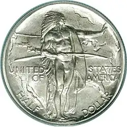 The bill required that the Association pay for the half dollars at par, and that the dies and other costs of preparation not be at the expense of the United States.[17] The figure of six million was the largest in American commemorative history, exceeding the five million for the Stone Mountain issue. Congress placed no restriction on which mint should strike the coins, and did not put a time limit on the authorization.[18] According to numismatists Anthony Swiatek and Walter Breen in their encyclopedia of US commemoratives, the bill passed "possibly because the stated purpose was nationalistic rather than obscurely local".[19] Coin dealer and author Q. David Bowers states that "on the surface the motivation seemed to be good enough ... doubtless many American citizens had family ties to the famous migration".[20]