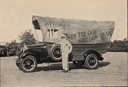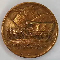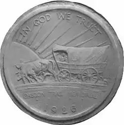After Meeker's death, the OTMA selected Howard R. Driggs, a professor of English education at New York University as his successor, and elected a new board of directors, which worked to clear the debt Meeker had accrued. Coins on hand continued to be sold.[44] It was able to persuade President Hoover to proclaim the Covered Wagon Centennial in 1930, the hundredth anniversary both of Meeker's birth and of the first wagon train leaving St. Louis for the Oregon country. One means of selling coins the Association devised was a campus-wide drive at Yale University, alma mater of Association executive director Lorne W. Buckley, in October 1930 to raise money for Trail markers. More than 600 coins were sold.[45]
