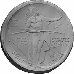 James Fraser designed the wagon side[a] while Laura Fraser designed the Indian side and converted both into relief models. Meeker pestered Laura Fraser to complete the modeling, as he wanted the half dollars available for sale at an upcoming event. She completed the work by July 30, 1926, when she wrote to enquire where she should send the designs for endorsement by the Commission of Fine Arts. This body since 1921 had been tasked with advising the Secretary of the Treasury on coinage design. She sent photographs of her models to the commission's offices. On August 5, 1926, commission chairman Charles Moore responded enthusiastically, informing her that not only had the commission endorsed the designs, but they were having the prints framed for their meeting room.[28] To save time, the hubs from which coinage dies could be prepared were made by the Medallic Art Company of New York, which had made reductions from plaster models to hubs for several commemorative issues. The resulting hubs were sent to the Philadelphia Mint, where working dies for the issue were made.[20][29] A compass rose on the Indian side, included in Laura Fraser's models, does not appear on the issued coin, though the reason for the change is not known.[21]