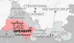 | Districts | Ileksky, Kurmanayevsky, Novosergiyevsky, Orenburg (Leninsky, Tsentralny), Orenburgsky, Pervomaysky, Perevolotsky, Sol-Iletsk, Sorochinsk, Tashlinsky, Totsky |