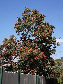 Occurring in spring (August to October), the bright red or orange-red inflorescences are terminal and well displayed, and consist of anywhere from 10 to 52 individual flowers split into smaller groups of 2 to 20 flowers, arranged in a corymb.[3] The flowers sit atop stalks (known as pedicels) up to 3.5 cm (1.4 in) in length, which arise in pairs off main horizontal stalks within the inflorescence. Each flower consists of a tubular perianth up to 4 cm (1.6 in) long, which partly splits along one side at anthesis to release the thick style. The stigma is contained within a slanting disc-like structure at the tip of the style. The tubular perianth splits into four segments at its tip, and the anther lies in the concave parts within each of these segments.[6] The pedicel and the outer surface of the perianth are pubescent (covered in short fine fur).[7] Flowers are followed by woody rectangular seed pods that sit on long stalks,[6] and are 7–10 cm (2.8–3.9 in) long.[3] Each pod contains 8 to 10 seeds,[5] and is ripe in February and March.[4] Each seed is separated from the others by a membranous separator, and has a long rectangular wing, which is much longer than the seed itself. The seedlings have obovate cotyledons that are 0.8–1 cm (0.3–0.4 in) wide by 1 cm (0.4 in) long.[7]