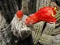 The carmine-red flowers have a bluish tinge and appear from the cephalium. They are up to 10 cm (3.9 in) long and have a diameter of 3 cm (1.2 in).[3]