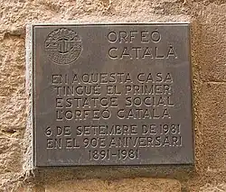 - ^ William H. Robinson, Jordi Falgàs, Carmen Belen Lord Barcelona and Modernity: Picasso, Gaudí, Miró, Dalí 2006 page 161 "Founded in September 1891 by two young musicians, Felix Millet and Amadeu Vives, the Orfeo Catala performed its first public concert in April 1892. As its importance increased the Orfeo came to need its own premises, and when the jeweler Joaquim Cabot was president of the choir Domenech was formally commissioned to design a building for it in October 1904. "