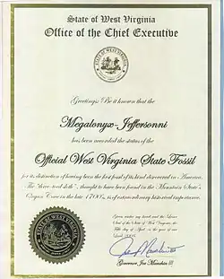 In 2008, the governor of West Virginia held a ceremony at Organ Cave to present the owner with a certificate stating that M. jeffersoni was the "Official West Virginia State Fossil" and repeated the assertion that it was indeed found in Organ Cave, but without producing any new evidence.