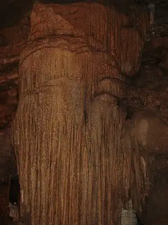 In 1973, the Organ Cave System—also known as the Organ–Hedricks Cave System[2]—was registered as a National Natural Landmark for being "the largest cave system in the State, containing many caves, one of which is Organ Cave.[3] Noted also for its saltpeter troughs and vats." (It is now the third-longest known cave in the state, after the Friars Hole Cave System in the same county and the Hellhole System in Pendleton County.[4]) Organ Cave has also been listed on the National Register of Historic Places since 2005.[5]